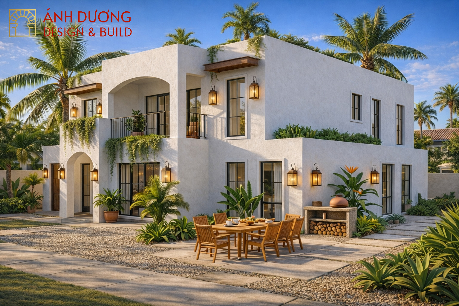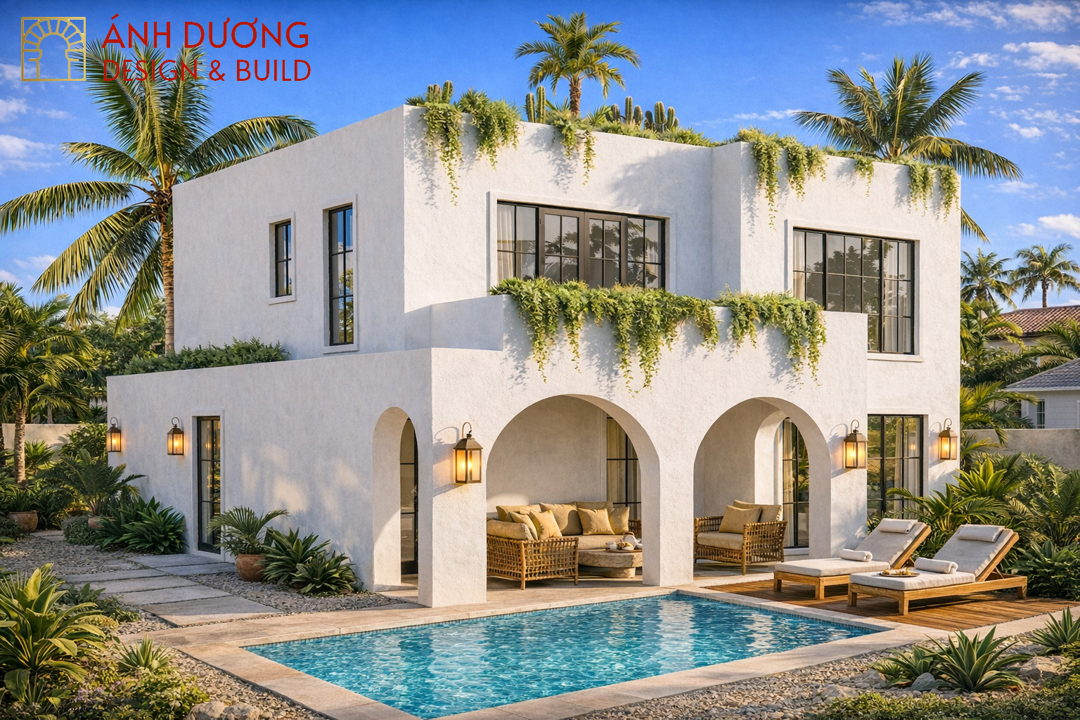Ngôi nhà hai tầng mang đậm tinh thần Địa Trung Hải hiện lên như một “ốc đảo nghỉ dưỡng” giữa đời sống hiện đại. Lấy tông trắng chủ đạo, công trình gây ấn tượng bởi những khối hình vuông vức, mềm mại bởi hệ vòm cong duyên dáng và các mảng xanh buông rủ tự nhiên từ ban công, mái nhà.