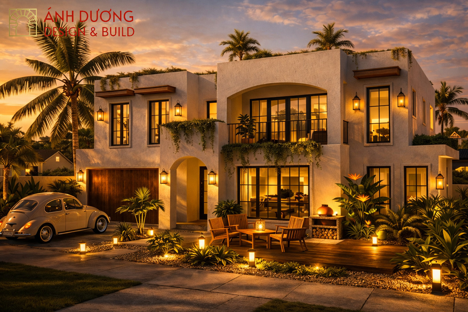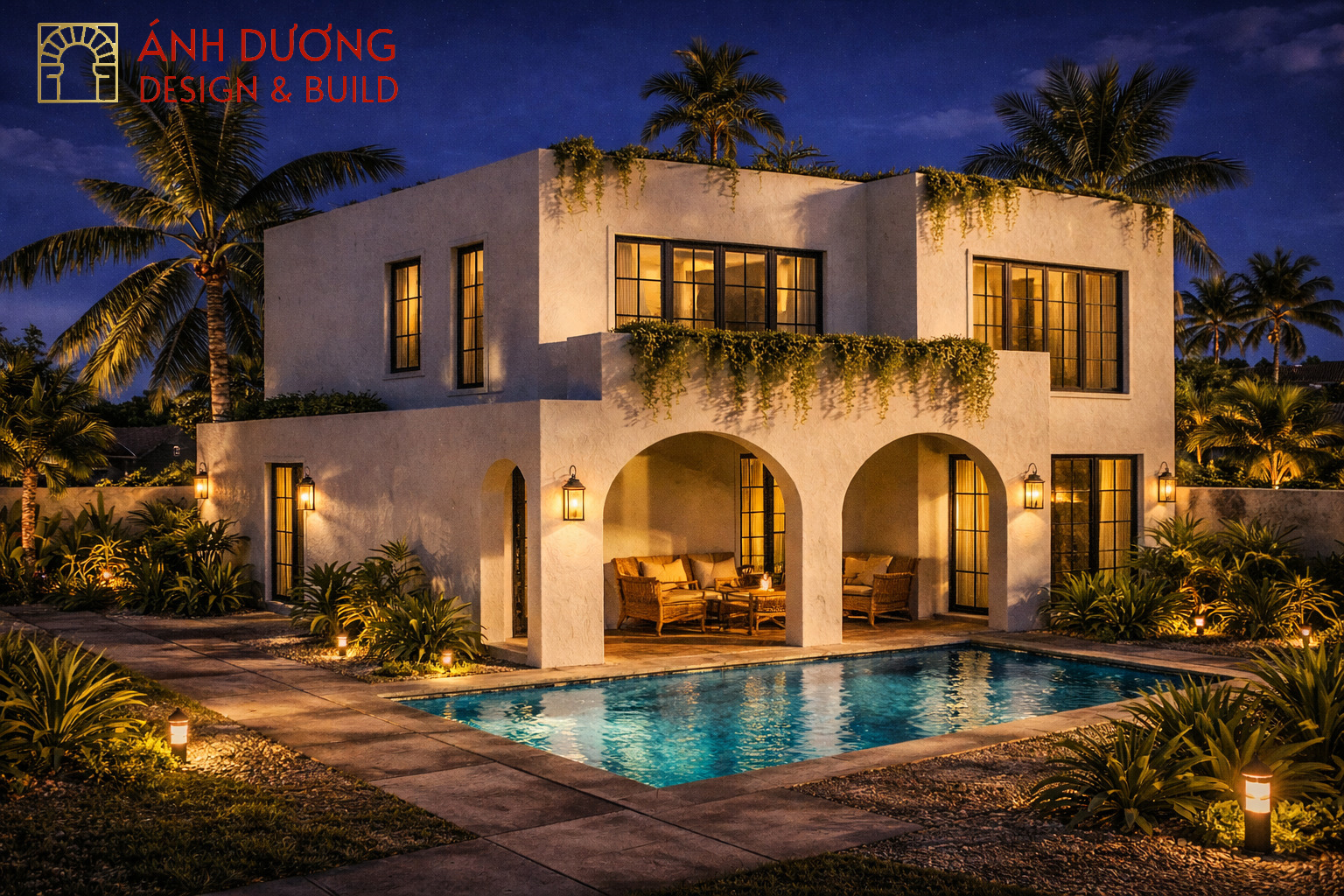 Thiết kế mở được khai thác triệt để với cửa kính lớn, ban công thoáng và khoảng sân vườn rộng kết hợp hồ bơi, tạo nên sự kết nối liền mạch giữa không gian trong và ngoài. Ánh sáng tự nhiên chan hòa ban ngày, trong khi buổi tối, hệ đèn tường ánh vàng ấm áp biến ngôi nhà thành một không gian nghỉ dưỡng đầy cảm xúc.